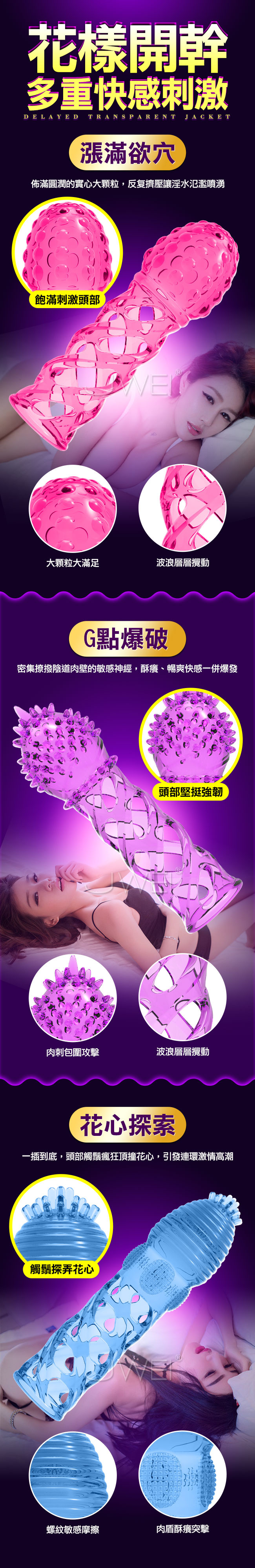 半接觸式的久戰雙爽套!鏤空花式水晶套採用解放陰莖的鏤空設計讓男人搞的暢爽,女人騷動高潮。套上後阻隔陰道對龜頭的直街刺激,提升男人忍耐力,讓女人的慾火飆到更高~網狀鏤空超薄設計真實碰觸陰道感受陰道蠕動的強烈刺激,鏤空凹凸來回摩擦撩撥強勁快感使男女共同爽翻天~使用優質的高透TPE軟膠插入時如老二般舒適溫和親近皮膚高彈力不怕拉扯每種尺寸都適用,讓每次性愛碰撞都能安心舒適。