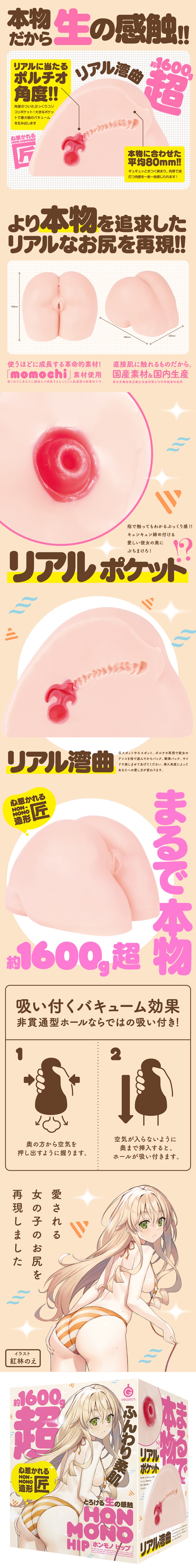 重現了所心愛的女孩的屁股。為了追求更上一層的真實感,迷人的HON-MONO造型重現了逼真的屁股,成為即使不用動手也能讓您身臨其境的自慰套!!平均大小,G點和A點,逼真的子宮頸角度,起伏的肉壁,講究的素材「有彈性又柔軟的皮膚,讓人融化的綿密觸感,鬆軟肉厚」。固定放置型,重量超過1600g的超大SIZE!!使用可安心直接與肌膚接觸的日本國產素材及日本國內生產。插畫師:紅林のえ 審查編號:2202788