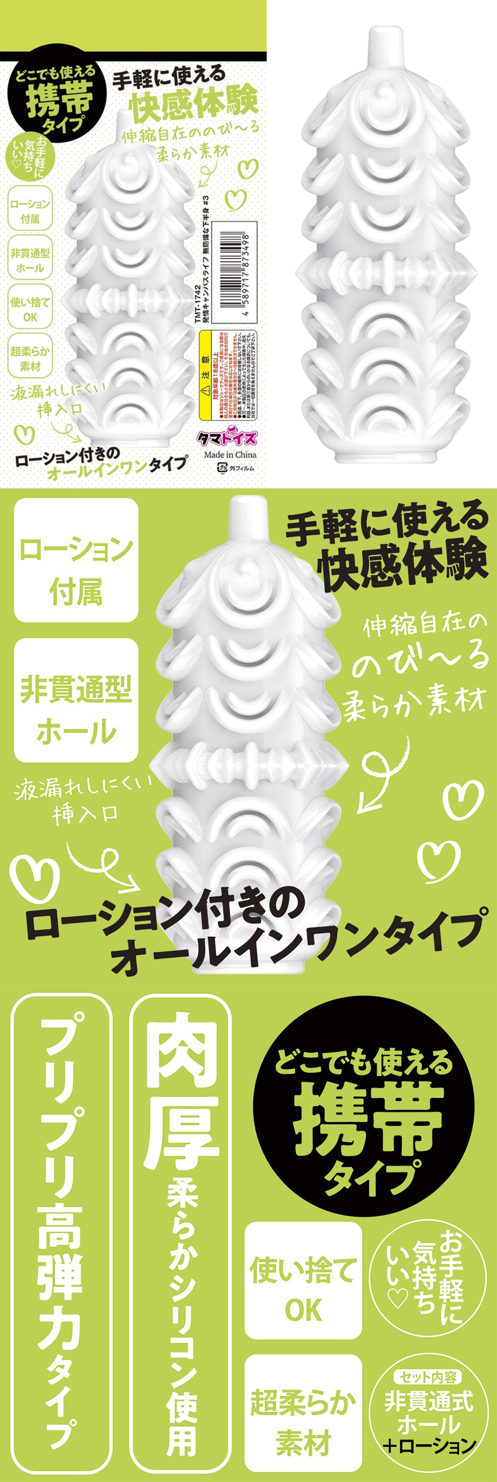 どこでも使える携帯タイプ プリプリ高弾力タイプ セット内容:非貫通式ホール+ローション ローション付きのオールインワンタイプ 肉厚な柔らかシリコン使用 手軽に使える快感体験 伸縮自在ののび~る柔らか素材 液漏れしにくい挿入口 ローション付属 非貫通型ホール 使い捨てOK 超やわらか素材